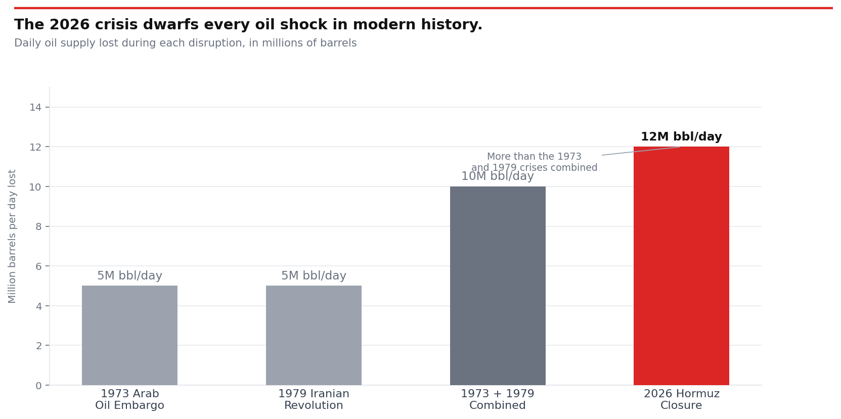 The April 15 moment: International Energy Agency Director Fatih Birol was direct when he addressed reporters: "April is going to be far worse than March." The logic behind that statement is not complicated, but it is worth following carefully. The ships that were at sea in late February, already loaded and already moving, are arriving now. They represent the trailing edge of the pre-crisis supply pipeline. Once they dock and offload, there is nothing behind them. The IEA has warned that the oil shortfall in April will be roughly double what it was in March. To put that in context, the world is already losing an estimated 12 million barrels per day, a figure that exceeds the supply disruptions of both the 1973 Arab oil embargo and the 1979 Iranian Revolution, combined. The most consequential date in this supply chain is approximately April 15. That is when, by most transit-time calculations, the last of the ships that departed the Gulf before or immediately after the conflict began will have arrived at their destinations. At that point, the cupboard goes bare. U.S. refineries will begin drawing down strategic reserves without any new tanker arrivals scheduled to replace what they consume.