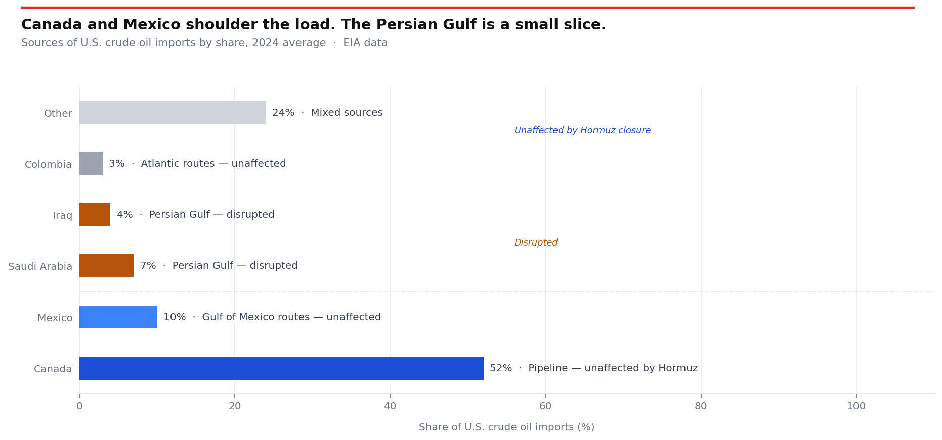 Where else the oil comes from: The United States is not entirely dependent on Persian Gulf crude, and the crisis has thrown into sharp relief the parts of its import network that are not affected by the Hormuz closure. Canada is by far the largest single source of foreign crude for the U.S., supplying 52 percent of all imports via pipeline systems that have nothing to do with ocean shipping or the Middle East. Mexico supplies another 10 percent via comparatively short routes across the Gulf of Mexico. The U.S. itself is the world's largest oil producer, and domestic shale and tight oil production can be scaled, though doing so takes weeks to months, not days. The more politically complicated piece of the supply puzzle is Venezuela. Before the reimposition of broad U.S. sanctions in 2019, Venezuelan heavy crude accounted for up to 800,000 barrels per day flowing into Gulf Coast refineries, many of which were specifically designed and configured to process that particular grade of oil. Redirecting existing Venezuelan exports is relatively fast. Ramping Venezuelan production back to pre-decline levels would take years, and doing so would require a significant shift in U.S. foreign policy. None of these alternatives, taken together, fully replace what came through the Strait.