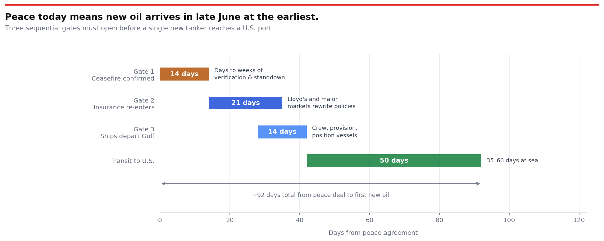 If peace was reached today: It is worth being precise about what a ceasefire, even a successful one, actually does to the oil supply timeline. The answer is less than most people assume, and certainly not immediately. Even with a signed peace agreement today, ships do not begin moving tomorrow. There are three sequential gates that must open before a single new tanker can depart the Persian Gulf for the United States. The first is ceasefire confirmation, which takes days to weeks depending on the complexity of the terms and whether Iranian naval authorities formally stand down the closure. The second is insurance re-entry. Lloyd's of London and the major marine insurers that have effectively exited the region will need time to reassess the risk environment, update their war-risk coverage, and begin writing policies again. That process takes one to three weeks. The third is ship operator re-engagement. Once a vessel has insurance coverage and a cleared legal path, the operator still needs to crew, provision, and position the ship. A realistic timeline from a signed peace deal to the first new tanker actually departing the Persian Gulf is two to four weeks. Then add the voyage itself: 35 to 60 days from the Gulf to the U.S. Gulf or East Coast. A peace agreement signed today means new Gulf oil does not reach American shores until mid-June to early July 2026 at the earliest. The total gap between now and any meaningful normalization of physical supply is 75 to 90 days. Gas prices above $4 per gallon are likely to persist through at least July, even in the most optimistic scenario. The SPR draw will also put a price floor under crude for the remainder of the year, as the government eventually needs to buy oil to replenish reserves it has now drawn to their lowest levels in roughly four decades. Markets will price that future demand accordingly.