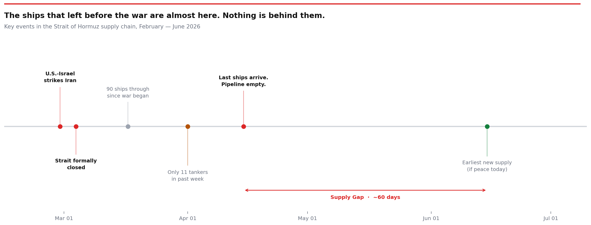 At a glance: In the weeks following the U.S.-Israel joint strikes on Iran on February 28, 2026, the Strait of Hormuz, the narrow chokepoint through which roughly twenty percent of the world's daily oil supply flows, was effectively sealed to Western-affiliated shipping. Tanker traffic that once averaged more than a hundred vessels per day fell to near zero almost overnight. The oil that was already at sea when the shooting started is arriving now. After those ships dock, there is nothing behind them, and the world is about to feel what that means.