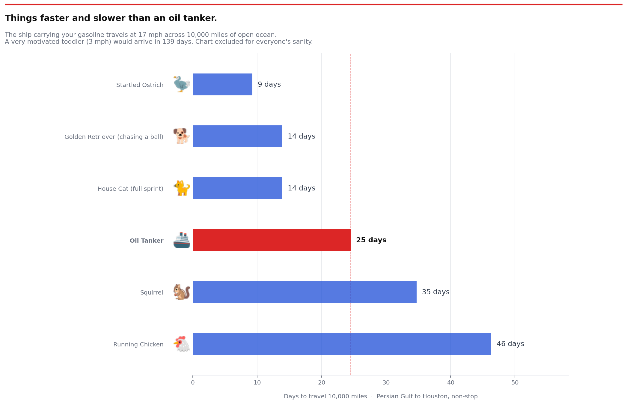 The geography of speed: To understand why this crisis unfolded over weeks rather than hours, you need to understand how oil actually moves across oceans. Tankers are enormous, efficient, and extraordinarily slow. A typical Very Large Crude Carrier cruises at somewhere between 13 and 17 knots, which translates to roughly 15 to 20 miles per hour. A car merging onto the highway moves four to five times faster. These are not vessels that can sprint to make up lost time. And because of this, the voyage from the Persian Gulf to the United States East or Gulf Coast takes anywhere from 35 to 60 days depending on routing, weather, and the specific destination port. That distance, measured in time rather than miles, is the central fact of this entire crisis. It means that decisions made on the water in early March will not show up at American refineries until April or May. And decisions made today, or not made today, will shape what those refineries are running on in June and July.